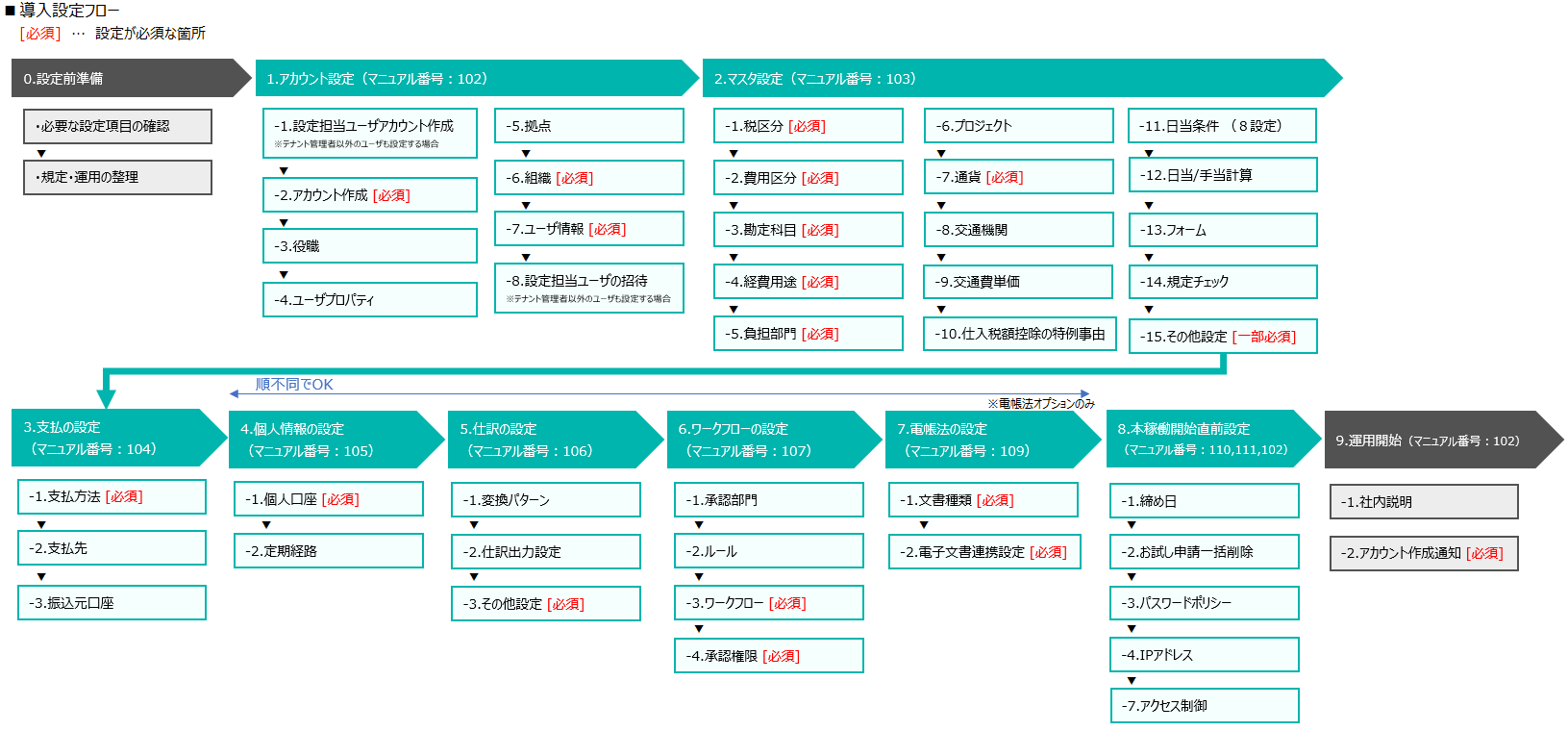 設定する項目には、設定が必須なものと、会社運用に合わせて任意で設定するものがあり、どの機能をどのように活用するかにより設定するマスタが異なります。
